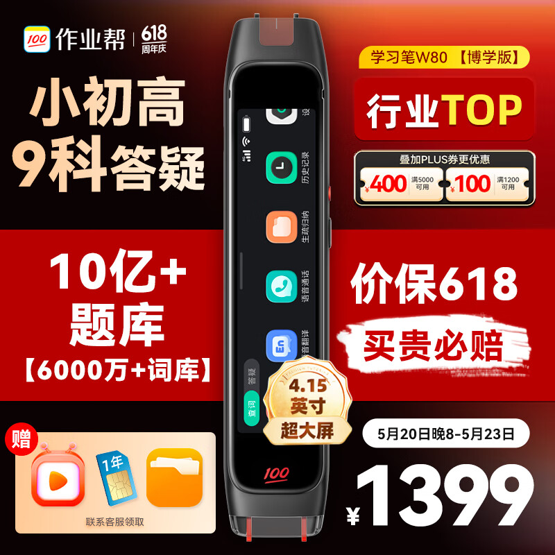 作业帮全科学习笔二代博学版W80 【无二次收费】小初高原题精讲 4.15英寸 中英文点读笔学习机词典笔价格:1399.00元!