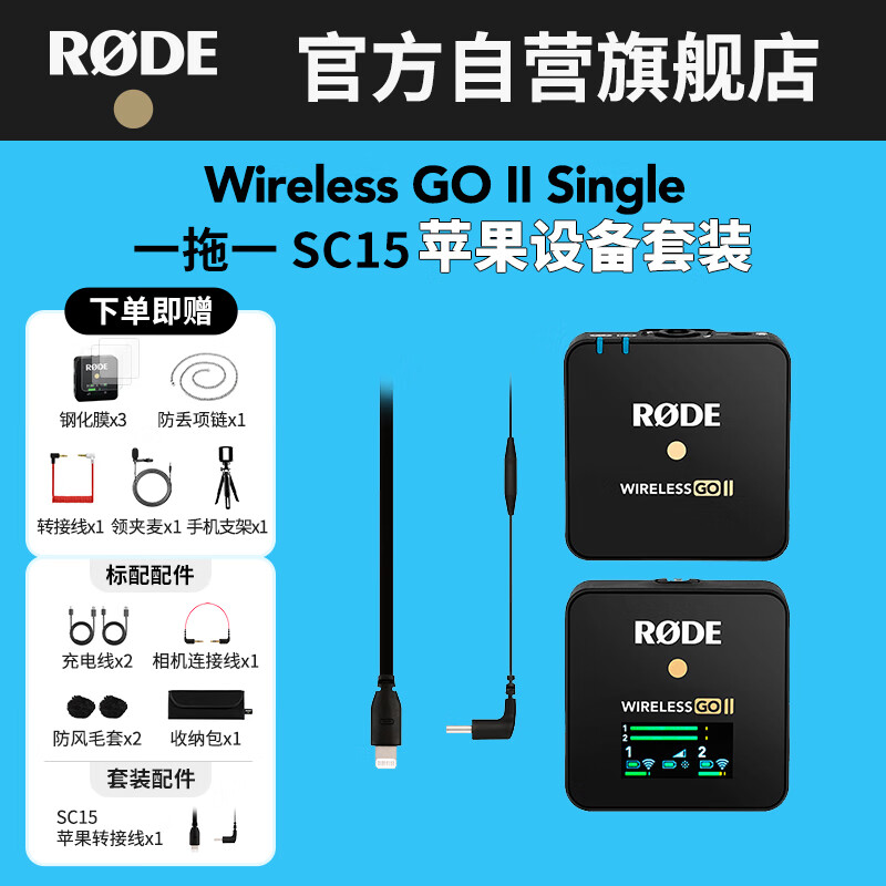 RODE罗德Wireless GO II Single无线麦克风一拖一直播录音VLOG相机手机专业话筒+(SC15苹果线套装)价格:1965.00元!