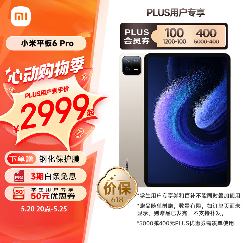 小米平板6Pro xiaomiPad 11英寸 骁龙8+强芯 144Hz高刷2.8K超清 12+512GB 移动办公娱乐平板电脑金色价格:3099.00元!