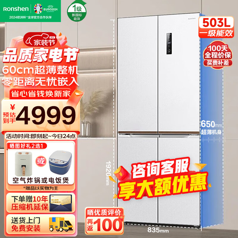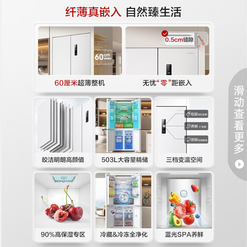 容声60厘米薄503升十字对开四开门超薄嵌入式冰箱家用变频一级能效大容量底部散热BCD-503WD1FPQ白色价格:5099.00元!