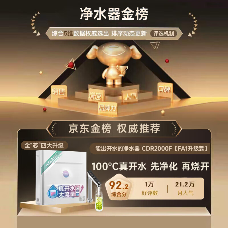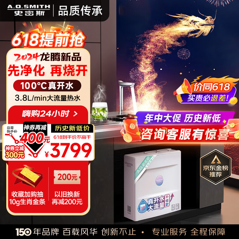 史密斯(A.O.SMITH)佳尼特【24年龙腾上新】加热净水器厨下家用净水机3.8升/分钟多档控温0陈水CDR2000F【FA1升级款】价格:4499.00元!