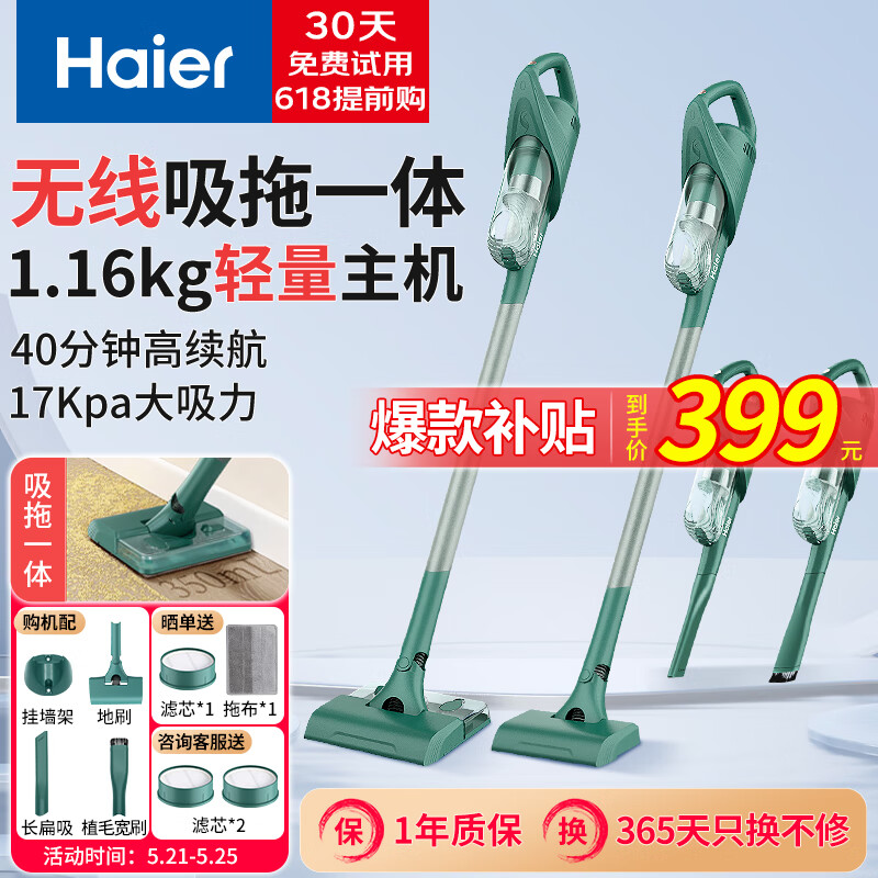 海尔(Haier) 吸尘器家用无线轻量手持推杆立式吸尘器多功能大功率大吸力吸拖一体机除尘HZ-SQ2价格:349.00元!