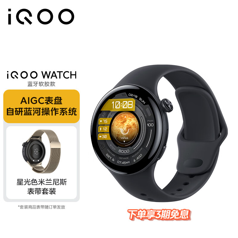 vivo iQOO WATCH 蓝牙软胶版浩宇黑AIGC智能手表盘血氧心率监测自研蓝河系统+星光色米兰尼斯表带套装价格:1123.00元!