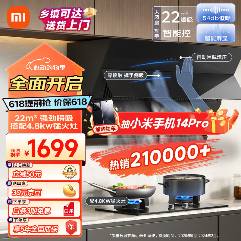 米家小米智能侧吸油烟机S1 22大吸力小尺寸抽油烟机燃气灶套装 手势操控 4.8kW烟灶联动 MJ02C液化气价格:1699.00元!