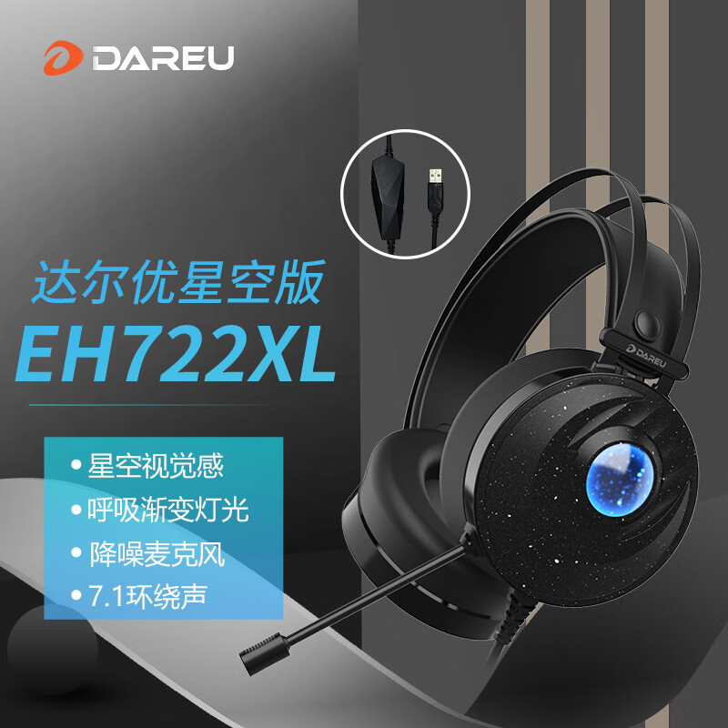 达尔优(dareu) EH722XL星空版 游戏耳机 头戴式耳机 电脑耳机 电竞耳机 吃鸡耳机 虚拟7.1声道 黑色价格:129.00元!