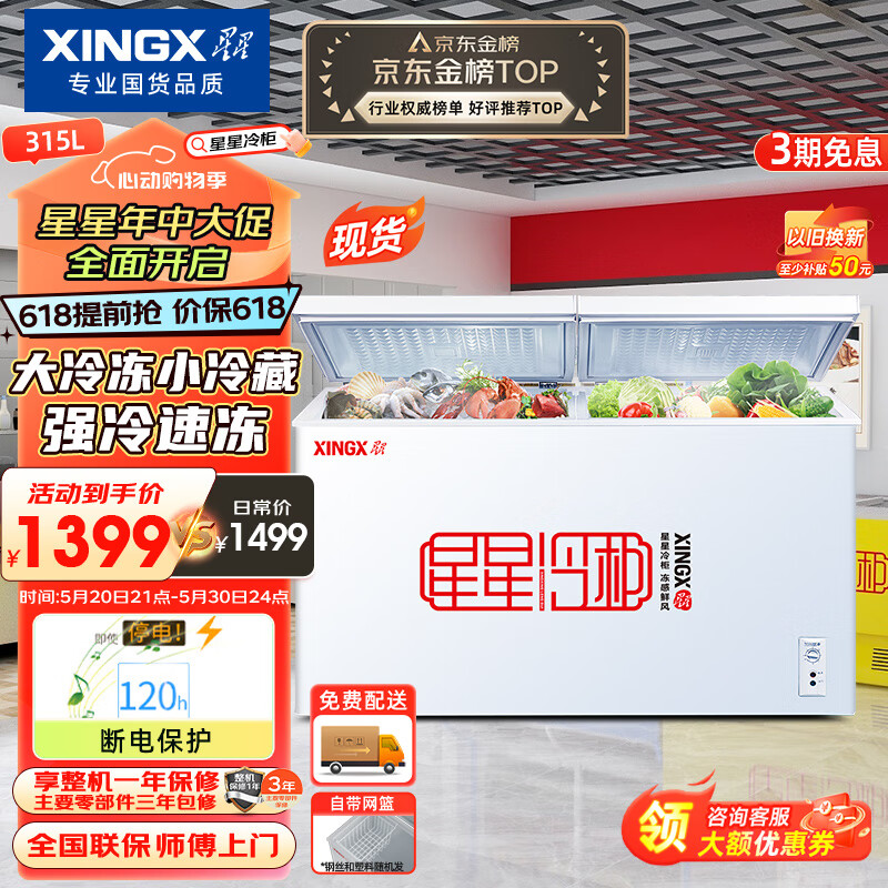 星星(XINGX) 315升 双温双箱冰柜 大冷冻小冷藏 卧式冰箱 大容积商用顶开门冷柜 BCD-315JE价格:1399.00元!