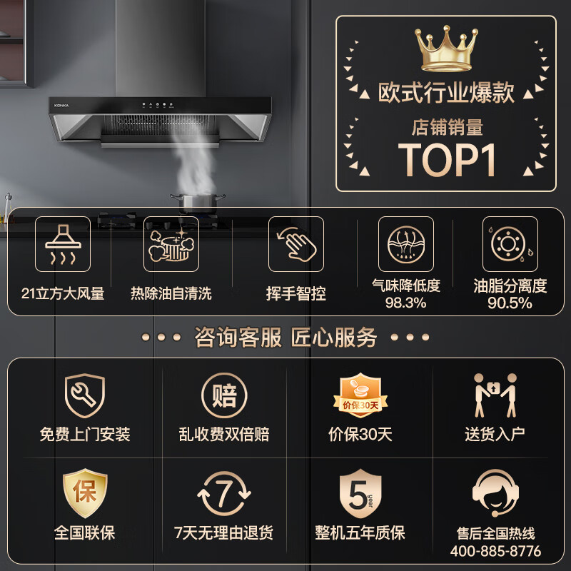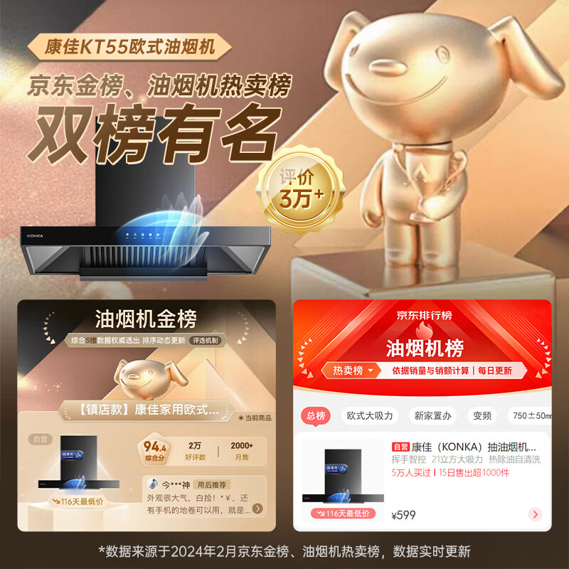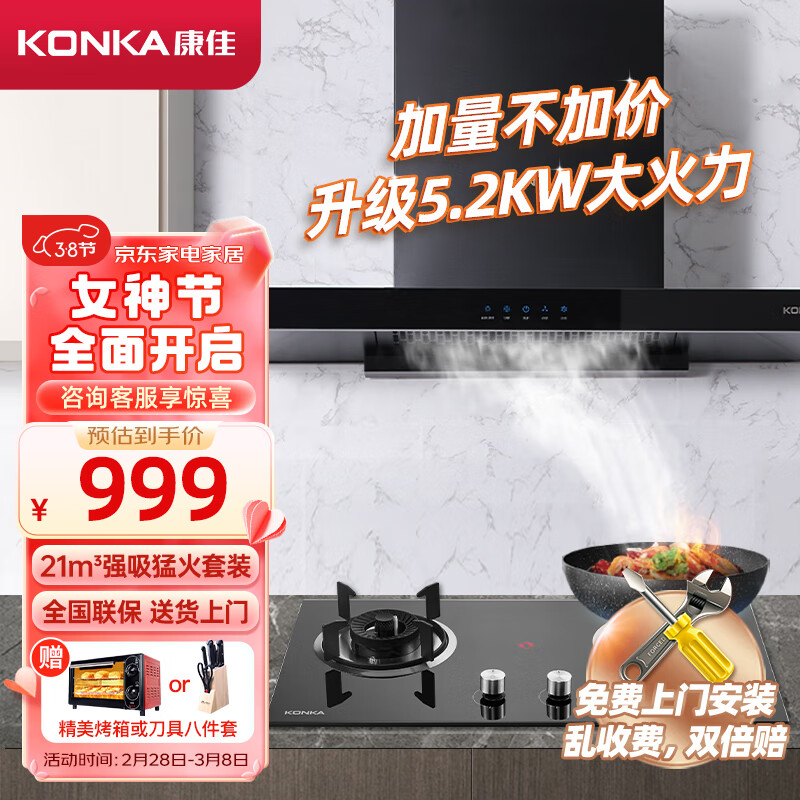 康佳(KONKA)抽油烟机燃气灶具套装 欧式顶吸21m3/min大吸力挥手自清洗烟灶两件套装 KT55+B500Y(天然气)价格:996.00元!