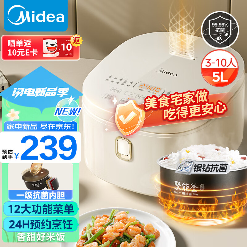 美的(Midea)电饭煲电饭锅5L银钻内胆12大菜单炫彩触控屏高颜值家用智能电饭煲MB-AFB5041RL(4-10人)价格:239.00元!