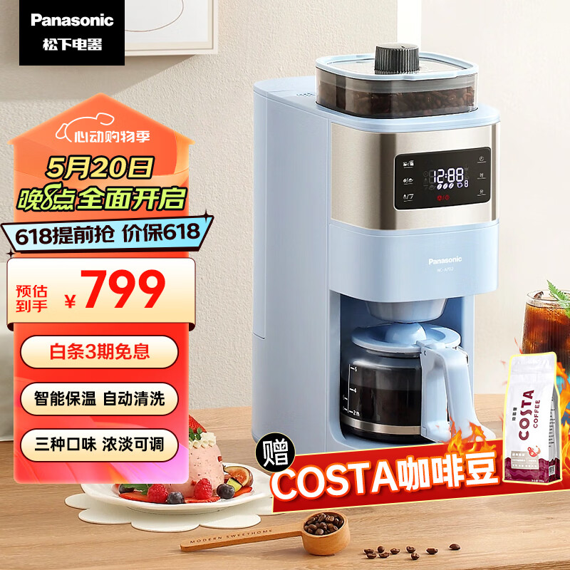松下(Panasonic) 美式咖啡机全自动家用 研磨一体 自动清洁 智能保温 多档浓度 豆粉两用NC-A702价格:789.00元!
