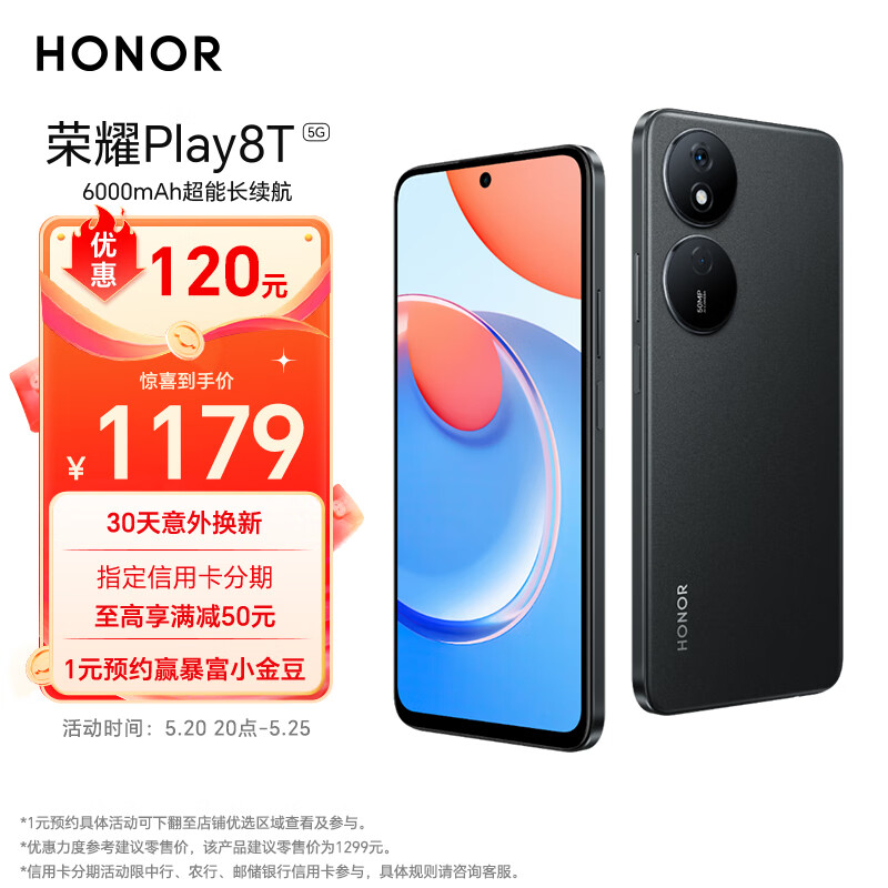 荣耀Play8T 6000mAh超能长续航 12GB+256GB超大双存 850nit高亮超清显示 12GB+256GB 幻夜黑 5G价格:1179.00元!