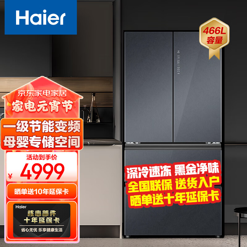 海尔冰箱家用十字门一级能效节能变频法式多门对开门电冰箱黑金净化三档变温BCD-466WGHFDEDSR[家电]价格:4999.00元!
