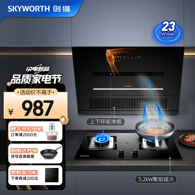 创维(Skyworth)油烟机 顶侧双吸烟灶套装 家用抽油烟机23风量自动清洗油烟机燃气灶具套装 Y3J+Z50BS-1?天然气价格:987.00元!