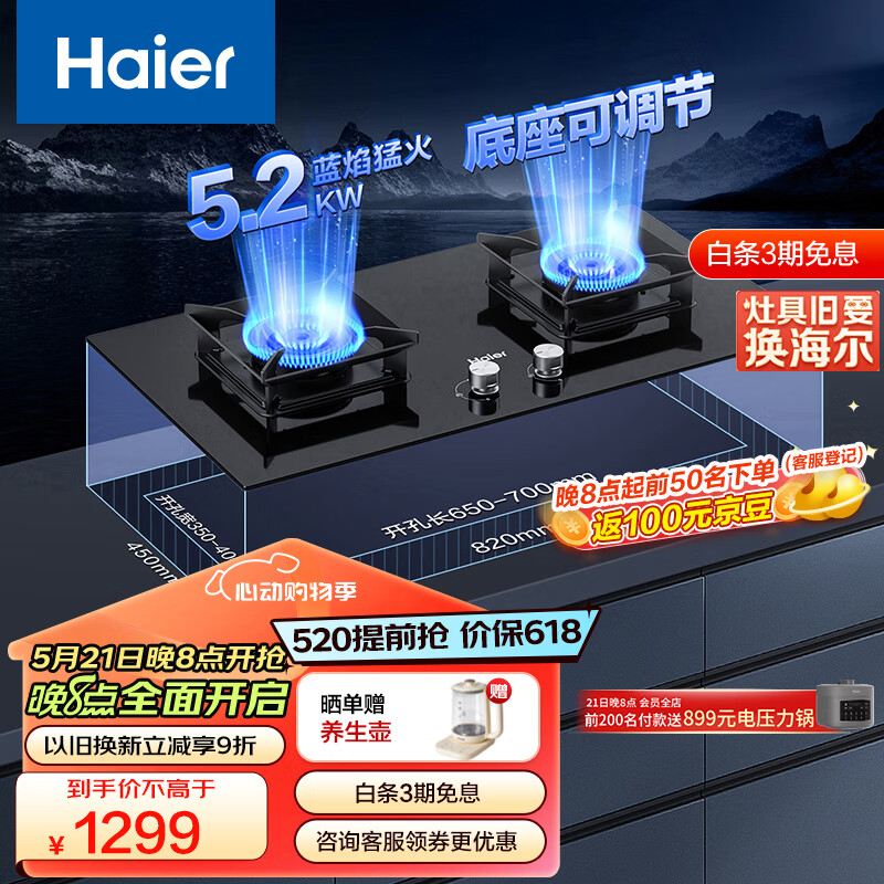 海尔(Haier)燃气灶天然气 家用双灶 5.2kw猛火灶 辟火聚能支锅架 820大灶面 熄火保护可调节底壳Q7BE3价格:1299.00元!