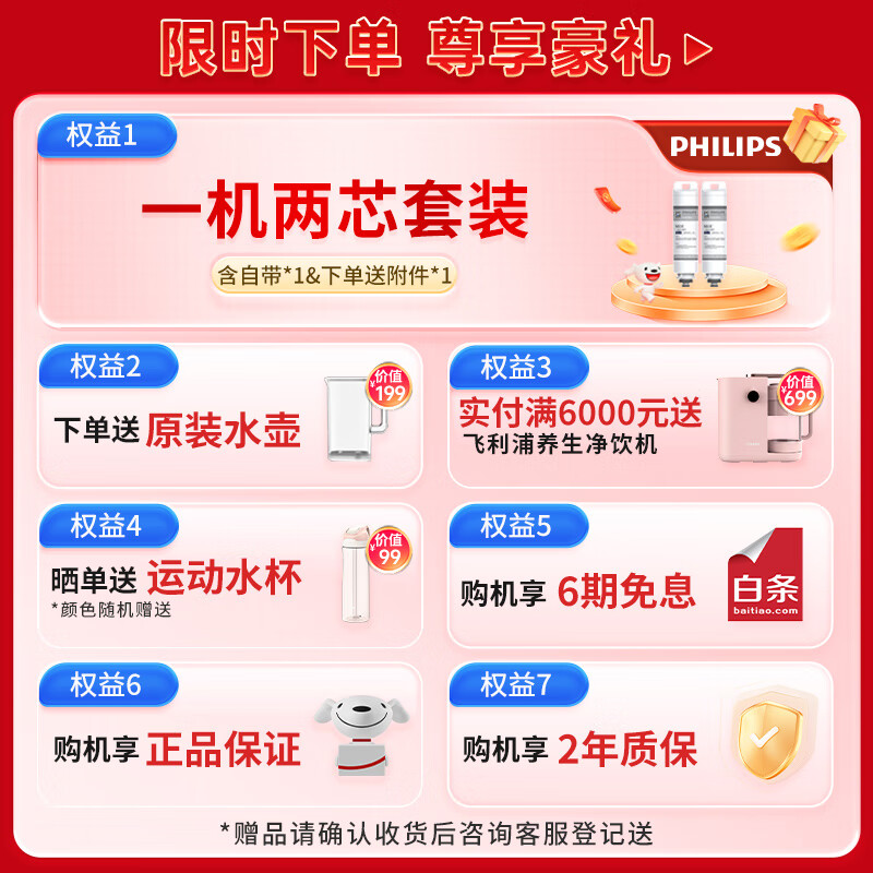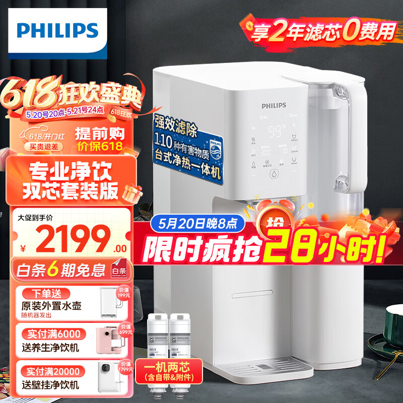 飞利浦(PHILIPS)Cube家用RO反渗透台式即热净饮水机加热直饮一体机富锶矿化免安装净水器ADD6860一机两芯价格:2199.00元!