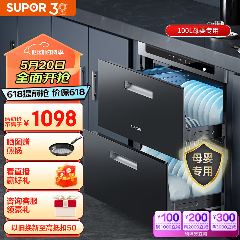 苏泊尔(SUPOR)消毒柜家用 嵌入式 消毒碗柜厨房茶杯碗筷高温紫外线消毒 奶瓶消毒柜大容量100L ZTD100G-508价格:1098.00元!