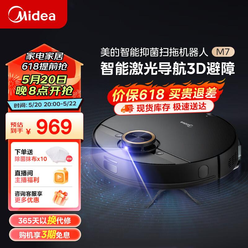 美的(Midea)扫地机器人扫拖一体M7 扫拖一体机器人 家用扫地机拖地机 曜石黑价格:1069.00元!