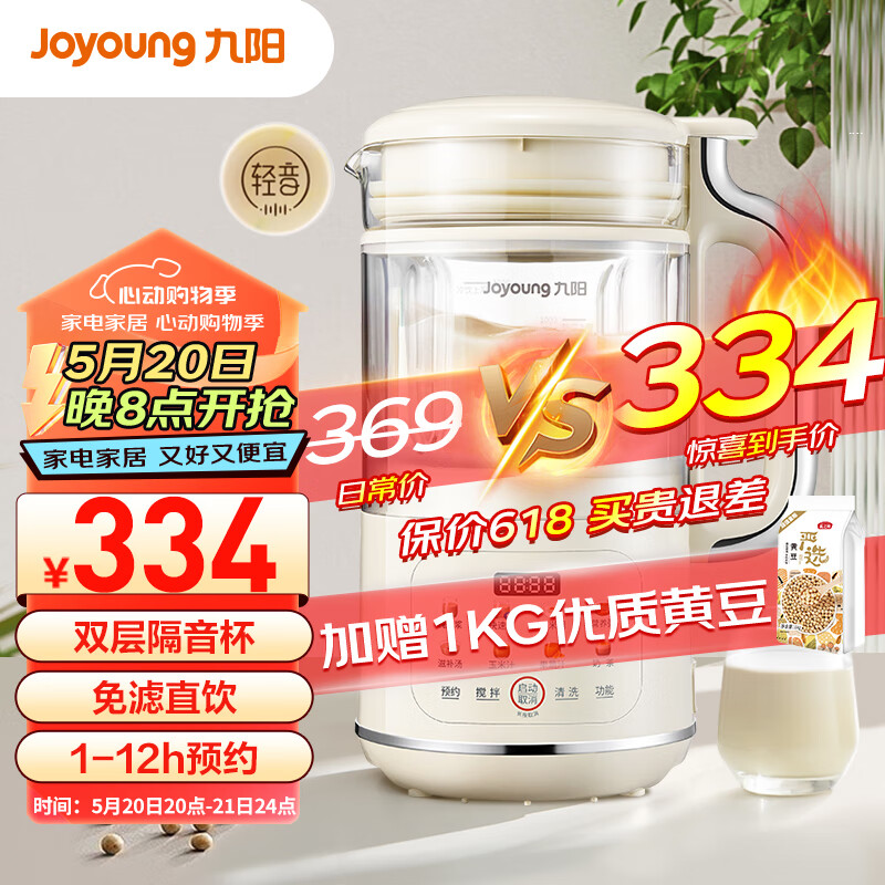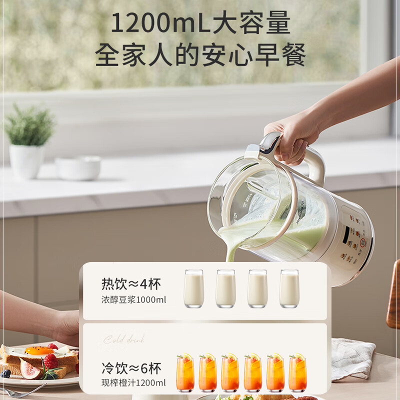九阳破壁机1.2L家庭容量豆浆机 快速浆8大功能预约时间可做奶茶一键清洗料理机DJ12X-D360价格:334.00元!