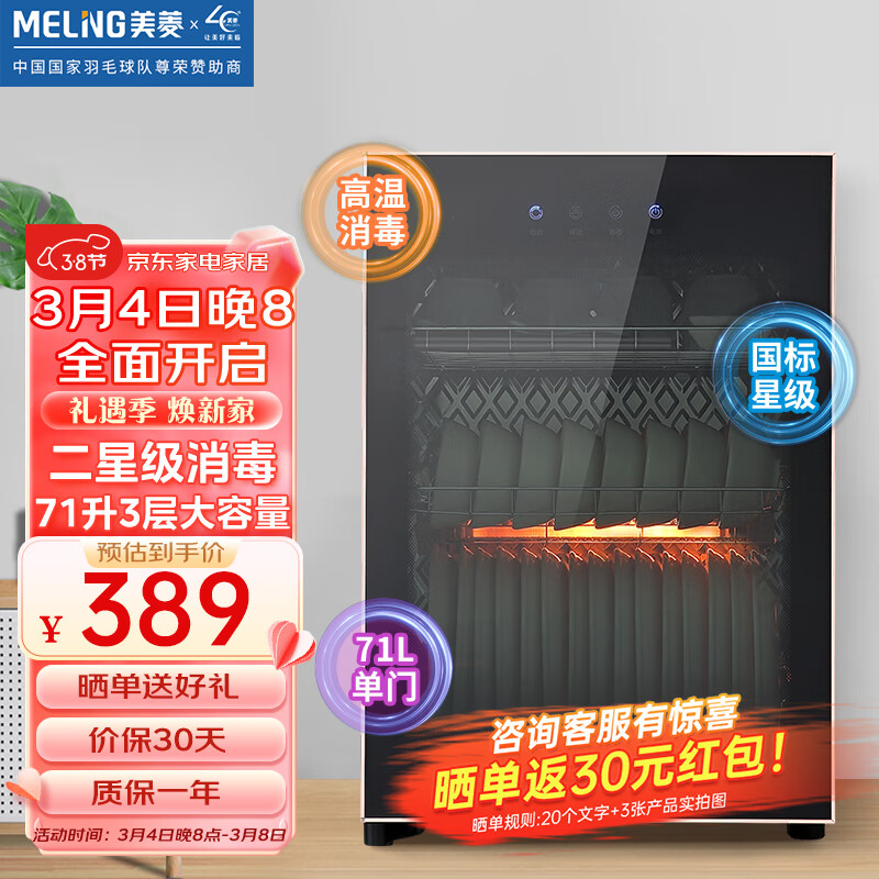 美菱(MeiLing)消毒柜家用小型台式71L大容量 智能触控消毒碗柜 厨房茶杯碗筷高温二消毒RTD71-88A价格:350.20元!