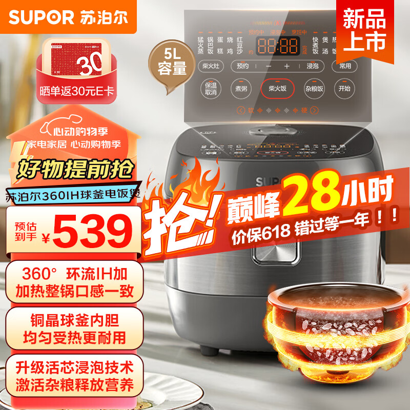 苏泊尔(SUPOR)电饭煲家用5L5-8人360IH球釜内胆电饭锅柴火饭升级活芯浸泡杂粮专攻家用智能多功能SF50HC0989价格:639.00元!