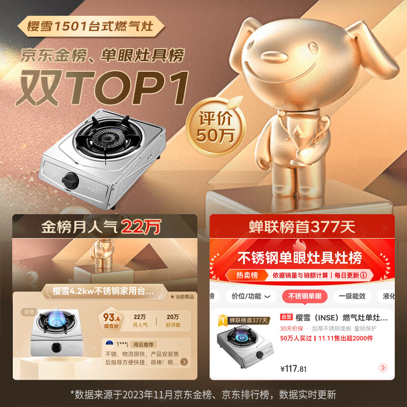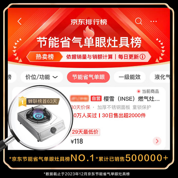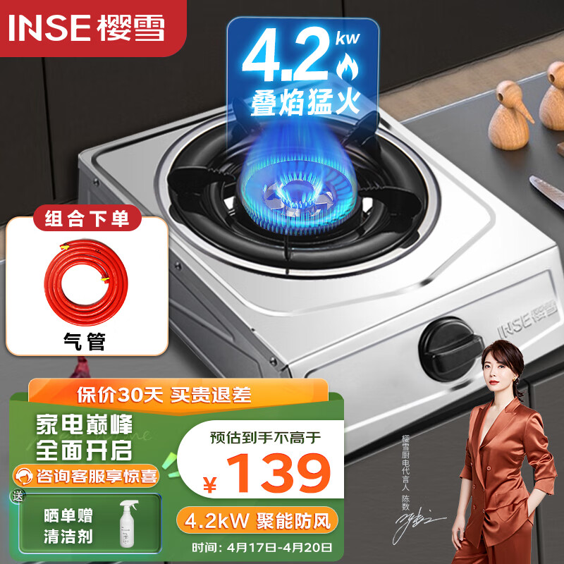 樱雪(INSE)燃气灶单灶 台式不锈钢面板4.2kW火力煤气灶单灶节能单眼灶 JZY-T1501(G)W液化气+气管价格:139.00元!