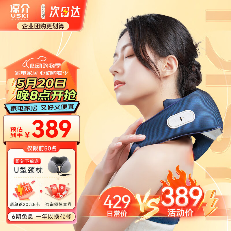 凉介USKI肩颈按摩器 C1 颈椎按摩仪 仿生热敷揉捏 斜方肌按摩器 生日礼物送女友 520情人节礼物 蓝色价格:439.00元!