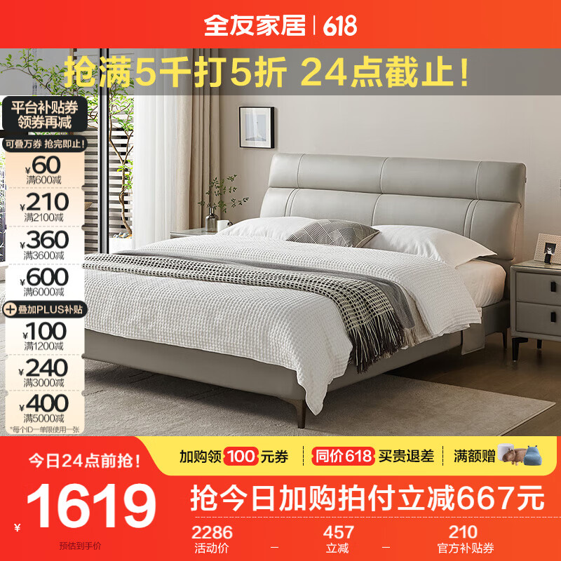 全友家居 真皮床 头层牛皮现代简约主卧室双人皮艺软包大床轻奢105251价格:2286.25元!