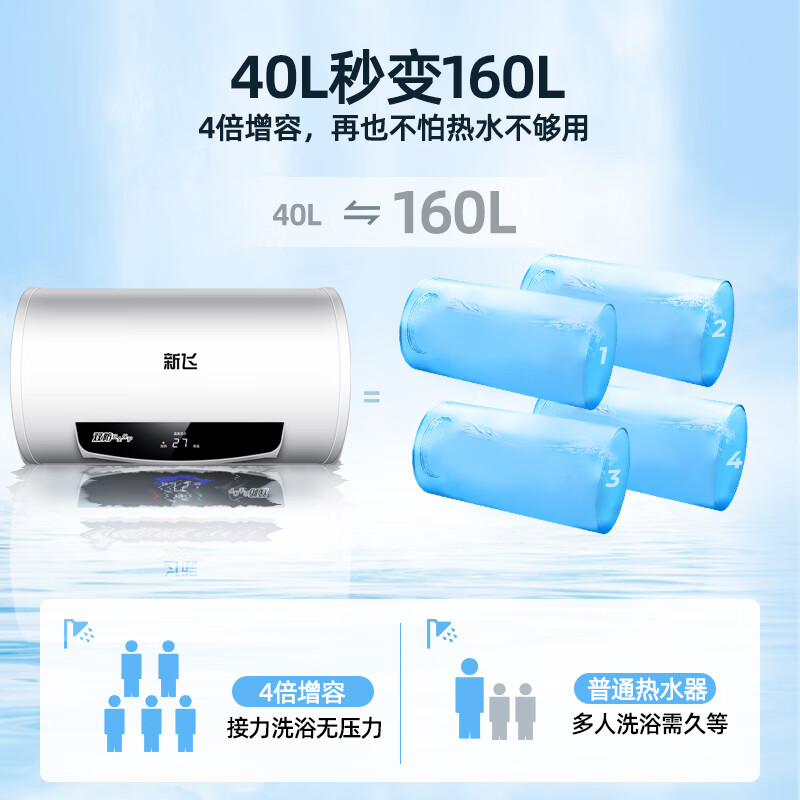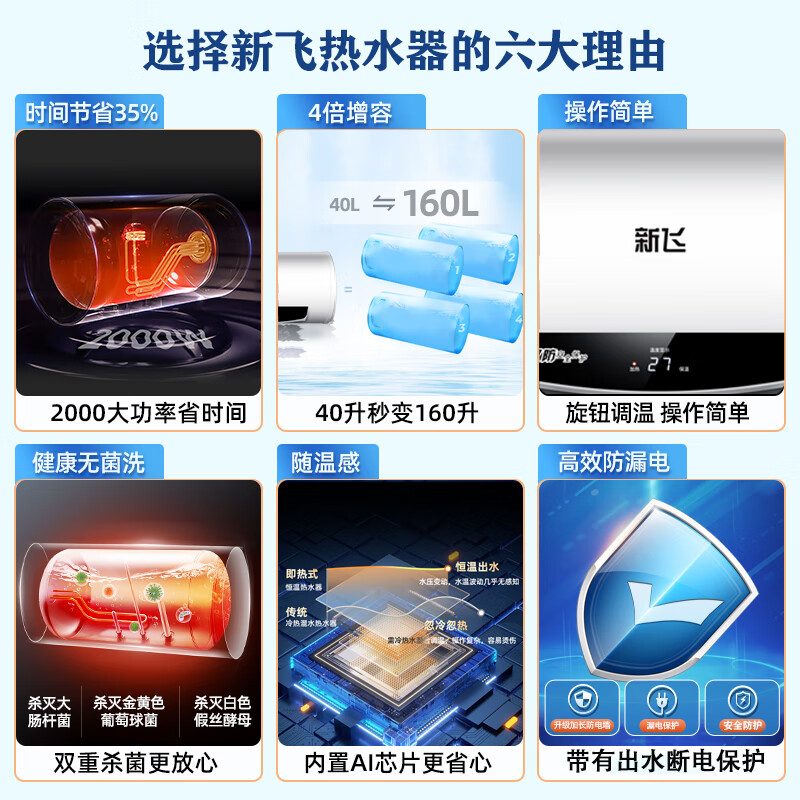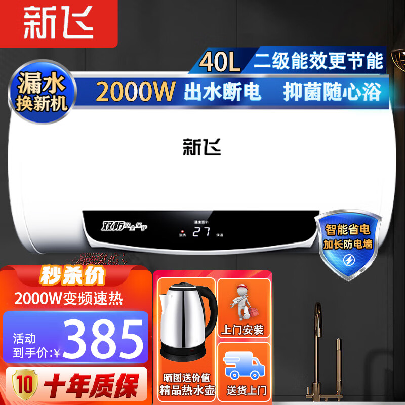 新飞热水器2000W速热节能省电40升储水式漏电预警电热水器二级能效出水断电 上门安装 DSZF-Y40I价格:385.00元!