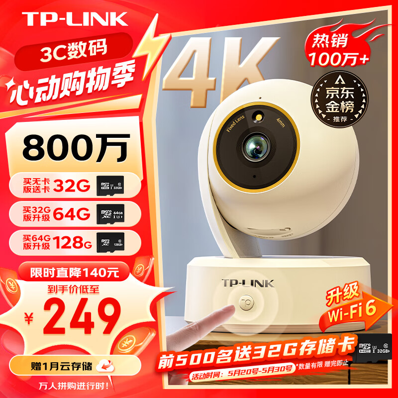 TP-link 800万监控摄像头家用监控器360度无死角带夜视全景无线家庭室内tplink手机远程婴儿宝宝看护器价格:249.00元!