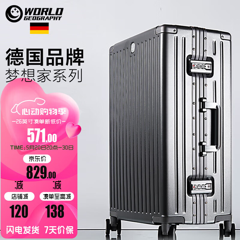 地理德国行李箱男女26英寸铝框旅行箱杯架拉杆箱万向轮密码箱 深空灰价格:829.00元!