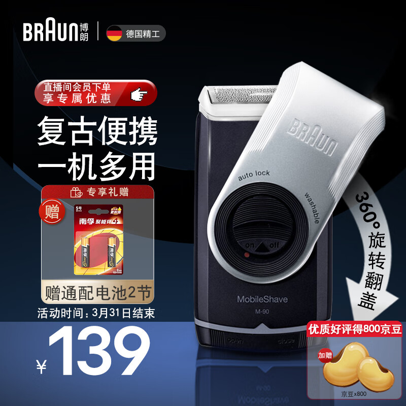 博朗(BRAUN)便携式剃须刀M90电动剃须刀携电池款价格:139.00元!