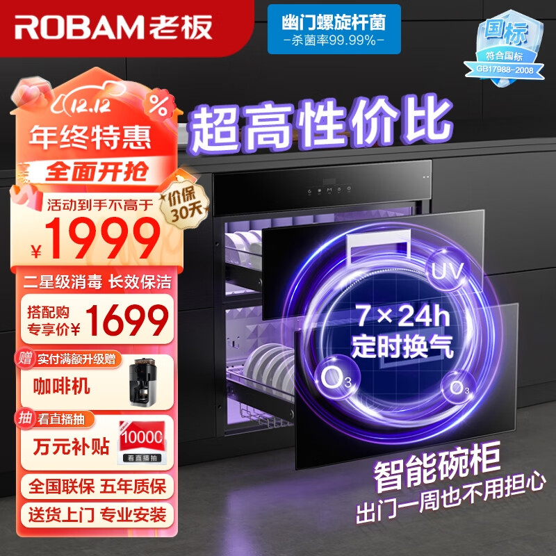 老板(Robam)消毒柜家用 嵌入式 消毒碗柜 105L双层大容量定时换气长效存储紫外线杀菌碗筷消毒柜XB711A价格:1999.00元!