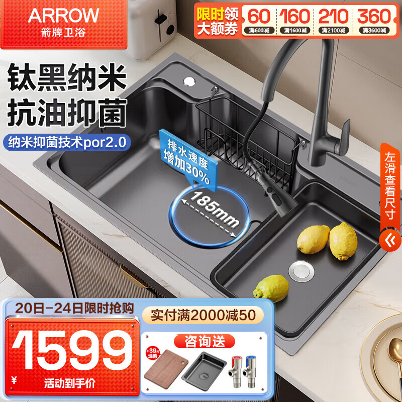 箭牌(ARROW)304不锈钢日式水槽大单槽洗菜盆纳米台上台中台下洗碗池 80*48纳米单槽-冷热枪灰抽拉龙头价格:1979.00元!