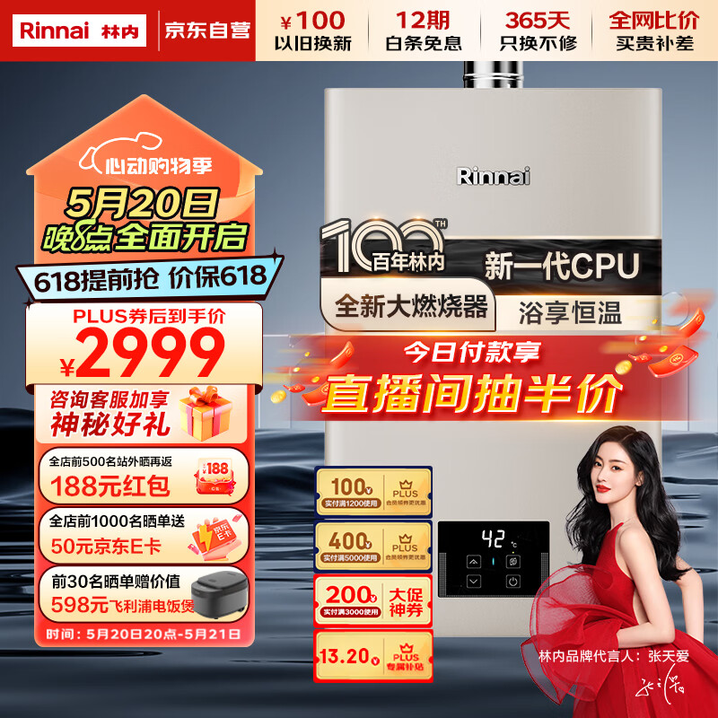 林内(Rinnai)【小蛮腰Pro】16升燃气热水器 全新智慧芯 恒温再升级 天然气热水器12T RUS-16GD32(JSQ31-GD32)价格:3299.00元!