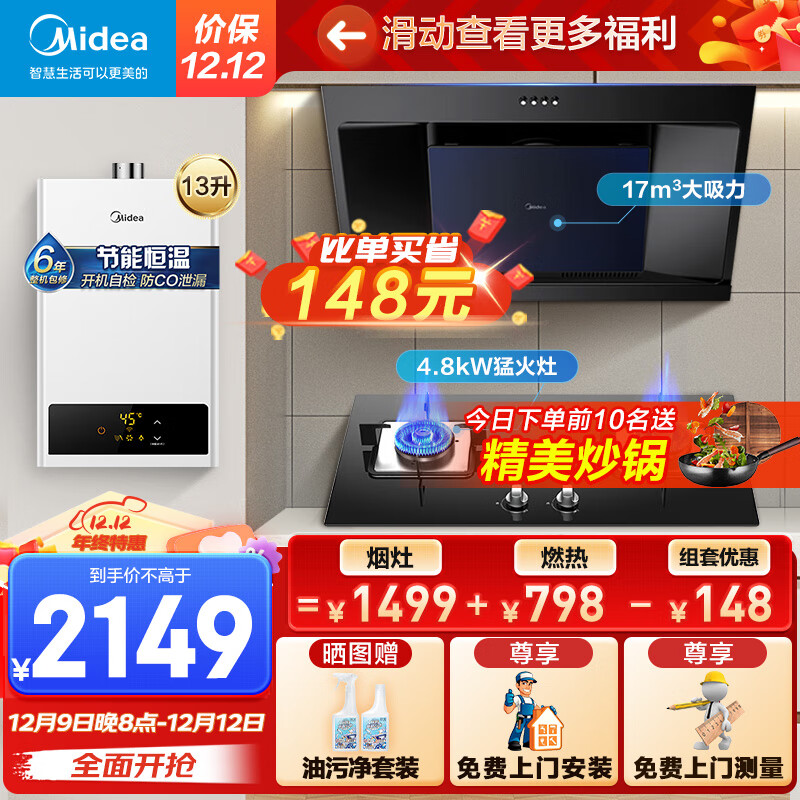 美的(Midea)侧吸抽油烟机灶具烟灶多件套装燃气热水器家用烟灶燃热厨房三件套JP11+Q217B+13HWF天然气价格:2149.00元!