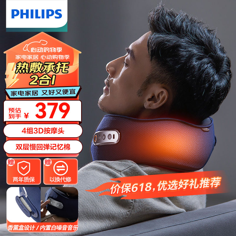 飞利浦(PHILIPS)颈椎按摩器 颈部按摩仪 U型颈椎枕 揉捏热敷肩颈按摩枕 送礼男女友礼品520节日生日礼物5111N价格:429.00元!