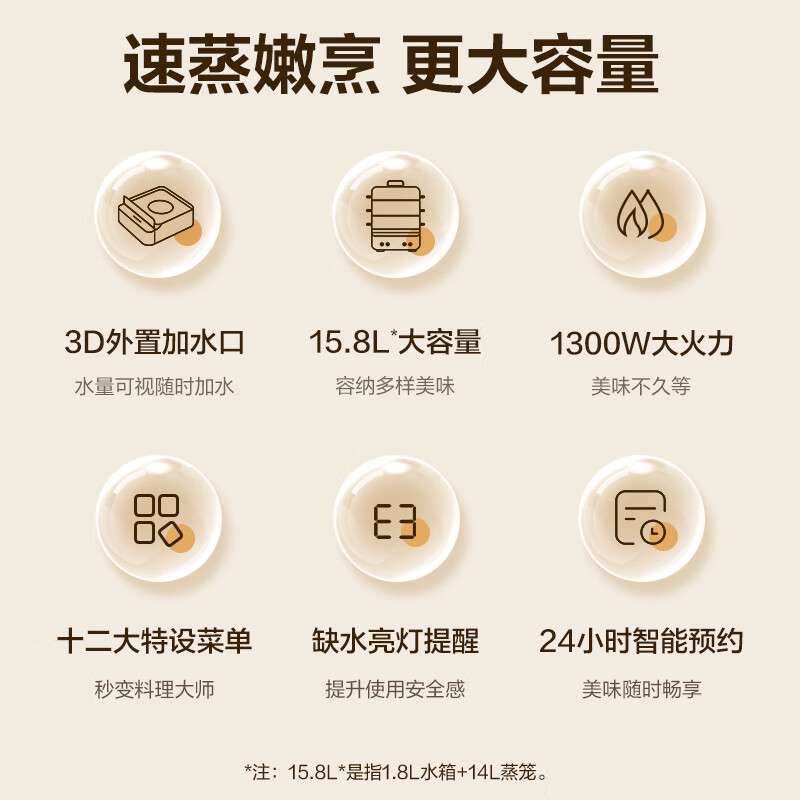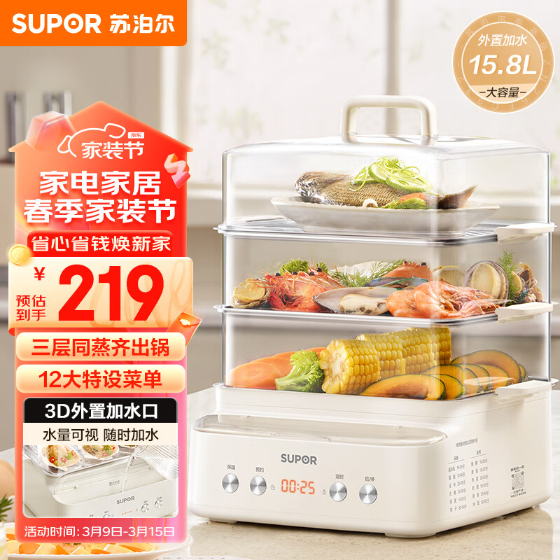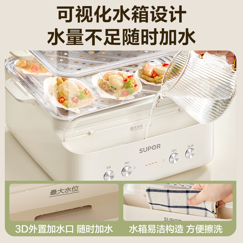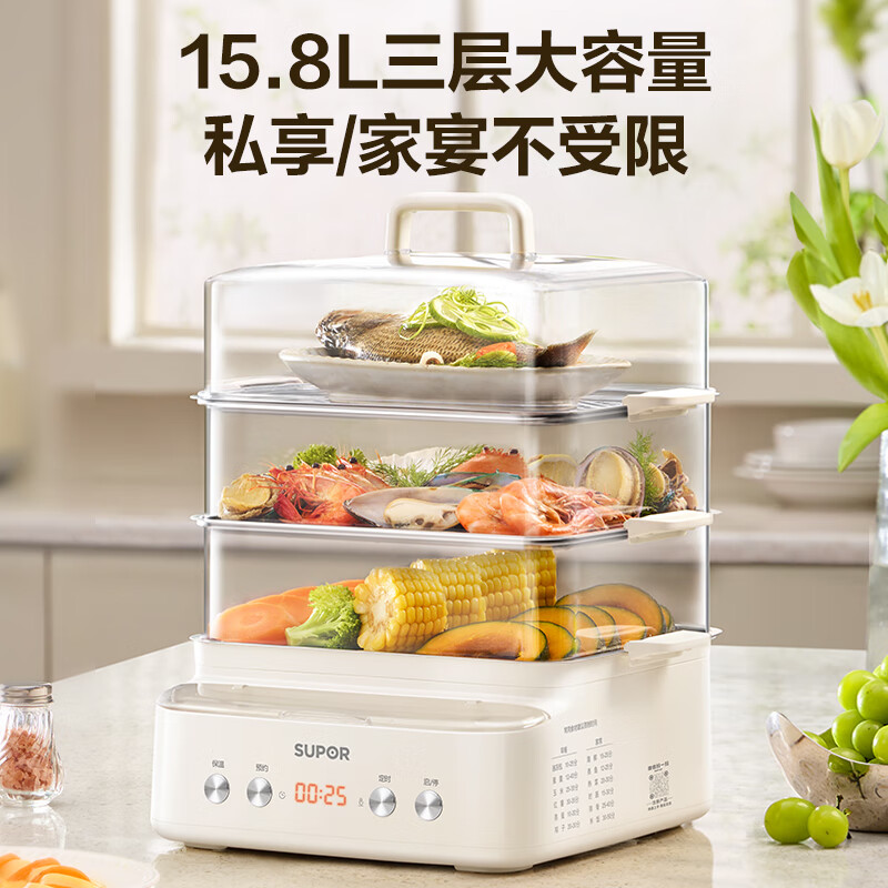 苏泊尔(SUPOR)电蒸锅15.8L家用三层大容量蒸锅电蒸箱多功能锅蒸馒头包子锅不锈钢蒸笼全透视窗ZN26FC932价格:219.00元!