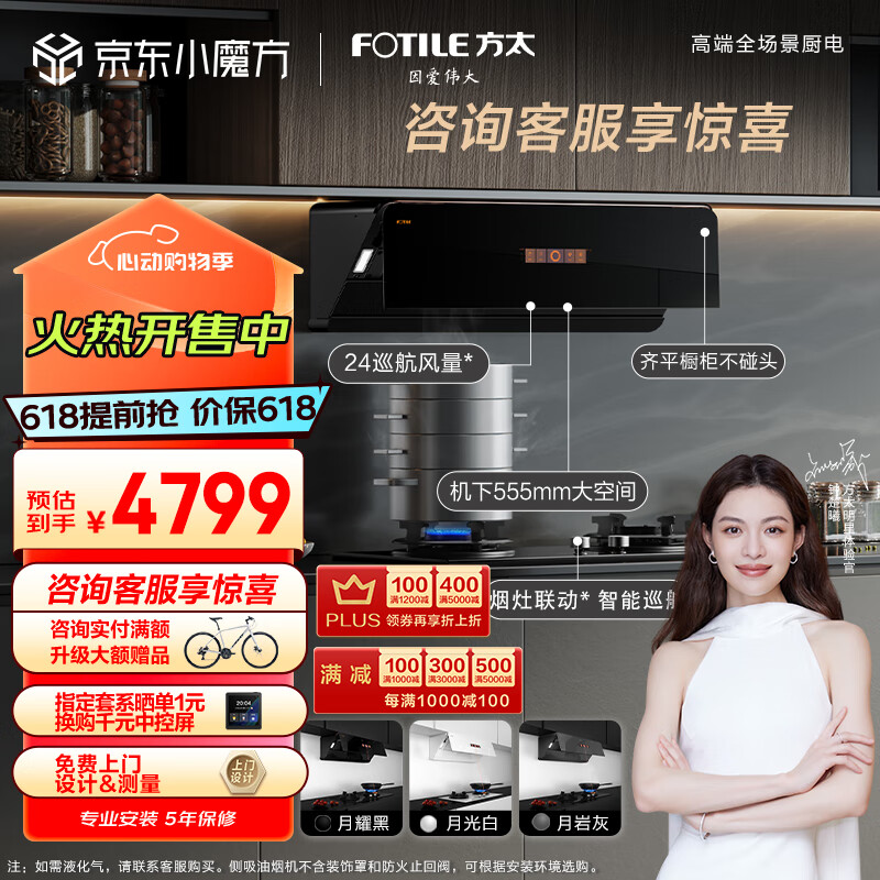 方太(FOTILE)新月抽吸油烟机灶具F1系列 家用侧吸变频24巡航风量烟灶联动01-F1A套餐天然气(三色可选)价格:5299.00元!