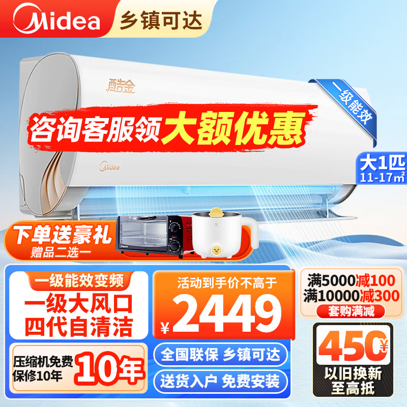 美的(Midea)空调挂机大1匹 酷金 新一级能效 变频冷暖 家用省电 卧室壁挂式一匹空调 KFR-26GW/N8ZHA1Ⅱ智选价格:2449.00元!