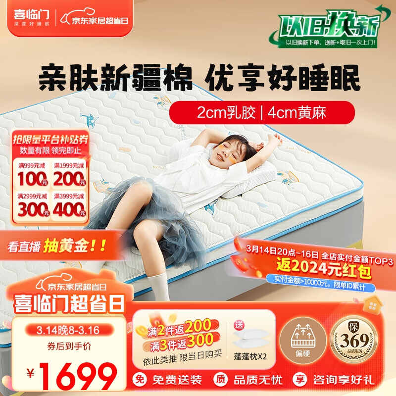 喜临门薄垫 2cm高纯乳胶 4cm黄麻床垫 青少年老人床垫 诺蓝10H 1.2*2.0m价格:1799.00元!