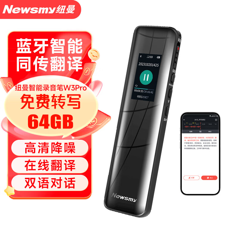 纽曼智能录音笔 W3 Pro 64G 蓝牙版 转写助手 声文速记 专业高清降噪 会议录音转文字 录音器 同传翻译价格:299.00元!