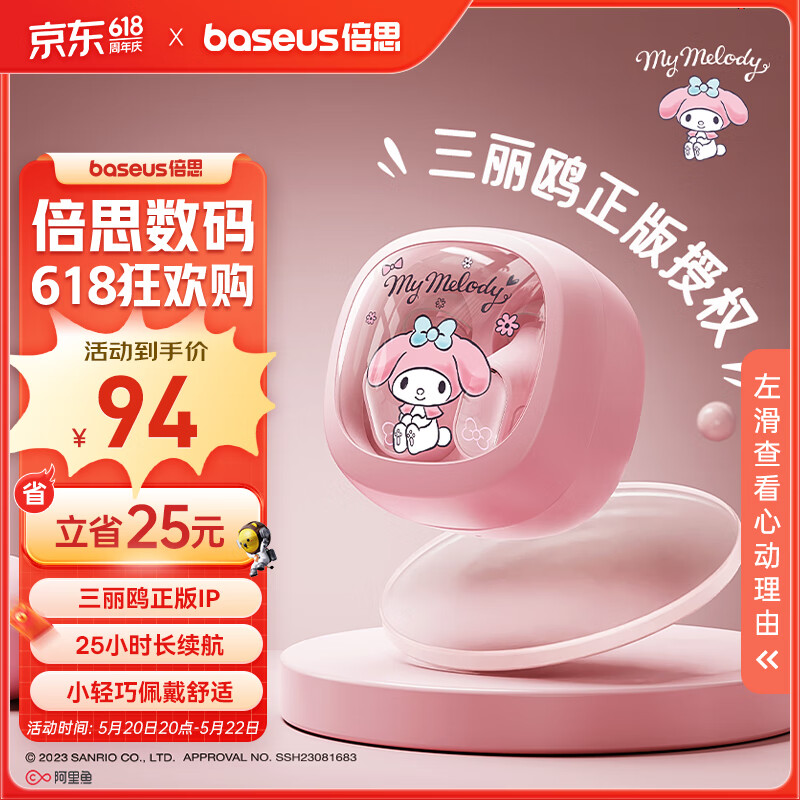 倍思WM02真无线蓝牙耳机 【三丽鸥正版授权】 佩戴舒适音乐通话520礼物适用苹果小米华为 美乐蒂 粉价格:119.00元!