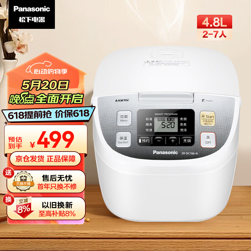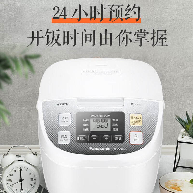 松下(Panasonic)4L电饭煲 家用大容量电饭锅 备长炭厚锅 智能米量判定 24H预约 SR-DC186-N价格:369.00元!
