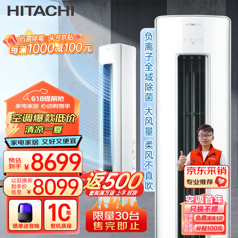 日立(HITACHI)白熊君新1级能效3匹圆柱式变频柜机客厅立式空调自动除湿防霉负离子除菌 以旧换新RAF/C-GH30PHAPC价格:9599.00元!