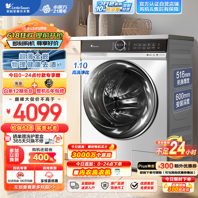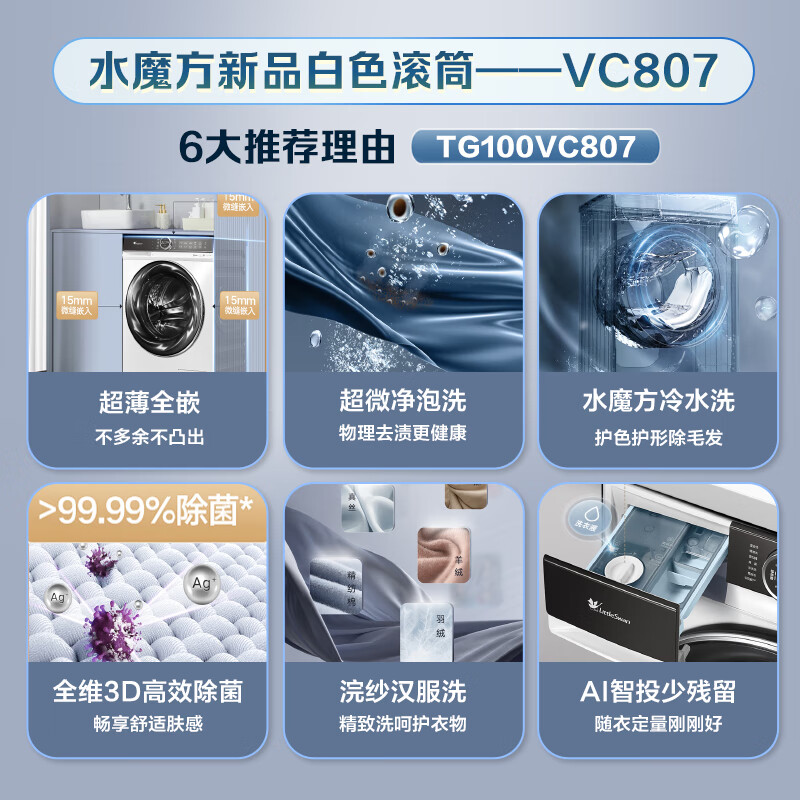 小天鹅(LittleSwan)滚筒洗衣机全自动【小蓝鲸青春版TG100VC807】超薄全嵌 超微净泡洗 白色防变黄 护色水魔方 10公斤价格:4099.00元!