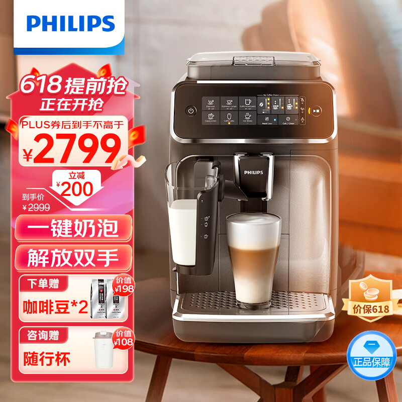 飞利浦(PHILIPS)云朵咖啡机3系EP3146/82 家用/办公室意式浓缩萃取全自动研磨一体机奶泡现磨咖啡豆系统价格:2999.00元!
