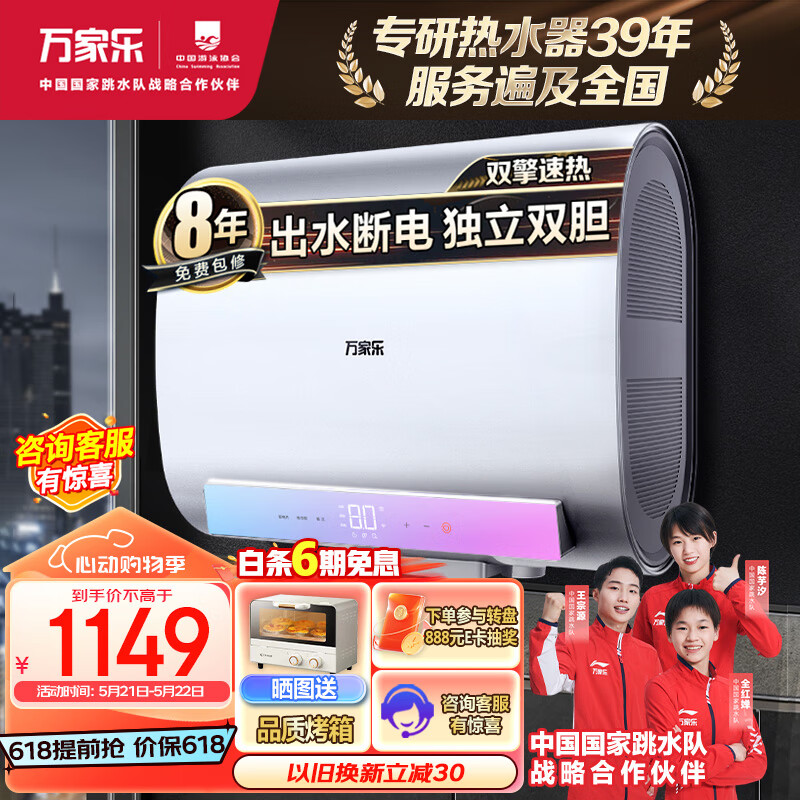 万家乐电热水器扁桶50升储水式双胆3000W速热 出水自动断电 WiF智控智能杀菌D50-FB2价格:1399.00元!