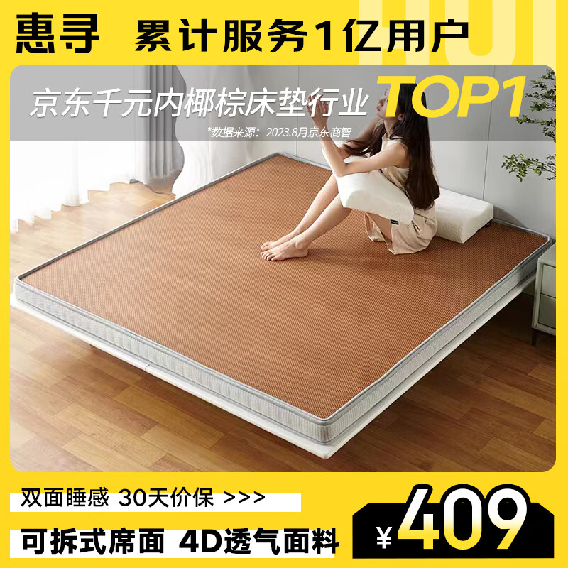 惠寻 京东自有品牌 凉席藤席椰棕床垫4D加厚双面硬棕垫10cm 1.35*2米价格:409.00元!