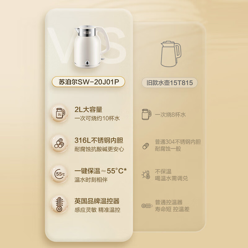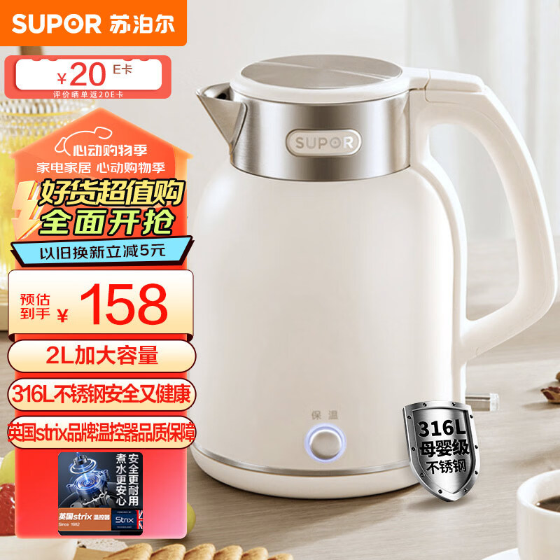 苏泊尔(SUPOR)电水壶热水壶 2L全钢无缝双层防烫电热水壶 316L不锈钢烧水壶 一键保温恒温 SW-20J01P价格:158.00元!