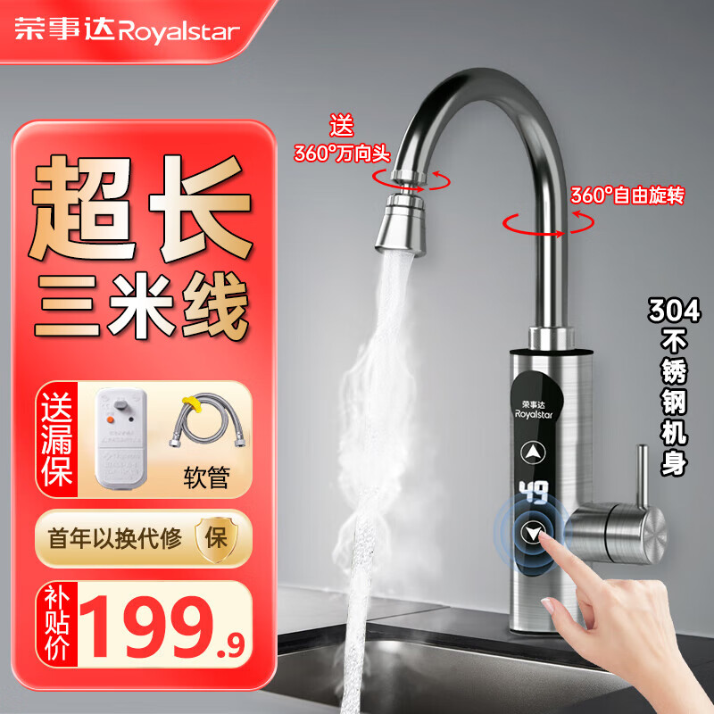 荣事达电热水龙头恒温不锈钢机身加热水龙头家用厨房卫生间热水器水龙头RB03Y-34不锈钢3M漏保(恒温款)价格:199.90元!