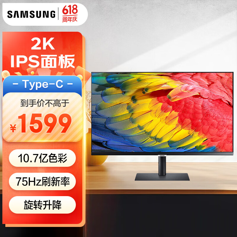 三星(SAMSUNG)23.8英寸 2K IPS 75Hz FreeSync HDR10 Type-c 65w 旋转升降 办公 电脑 显示器 S24A600U价格:1799.00元!